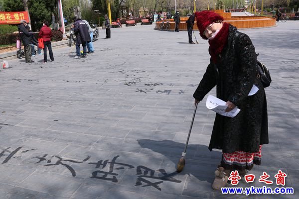營口楞嚴寺公園內,每逢早晚,無論春夏秋冬,都能看到地書愛好者的身影。他們中有書法愛好者,也有耄耋之年老人,他們手握自制的大筆,以水為墨,以地當紙,儼然成了公園里一道靚麗的風景。