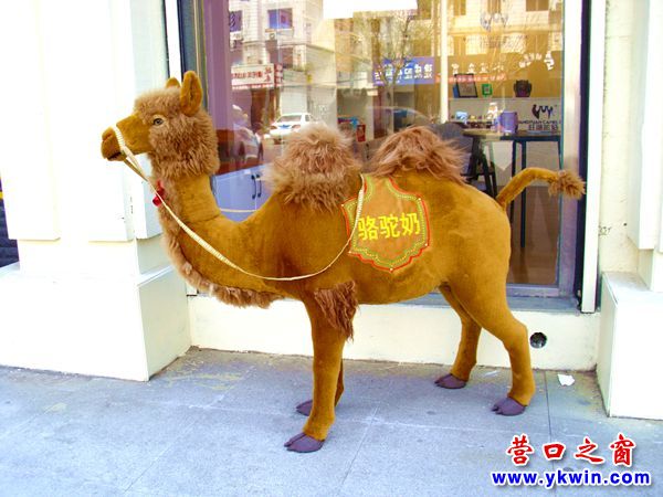(營口之窗網(wǎng)訊 胡 然)4月23日,在營口市東風(fēng)路大潤發(fā)超市附近見到了一峰“駱駝”。不少市民見到了它還和它合影留念。經(jīng)詢問,它來到營口還“馱”來了自己“產(chǎn)”的奶和奶粉。從而結(jié)束了營口沒有駱駝奶和駱駝奶粉的歷史。