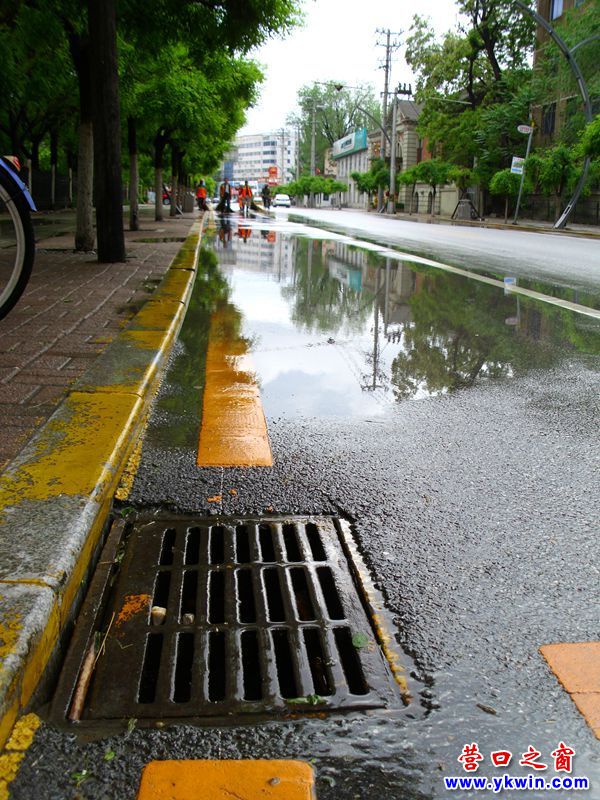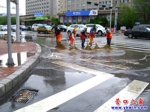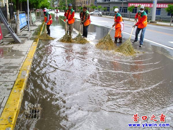 (營(yíng)口之窗網(wǎng)訊 胡 然)5月23日下午,下了大半天的雨終于停了下來。這時(shí),營(yíng)口市的環(huán)衛(wèi)工人紛紛三五成群地用大笤帚將街路邊低處的積水推向高處的下水井里。這種現(xiàn)象在營(yíng)口市普遍存在。下面僅舉兩例: