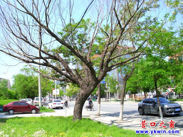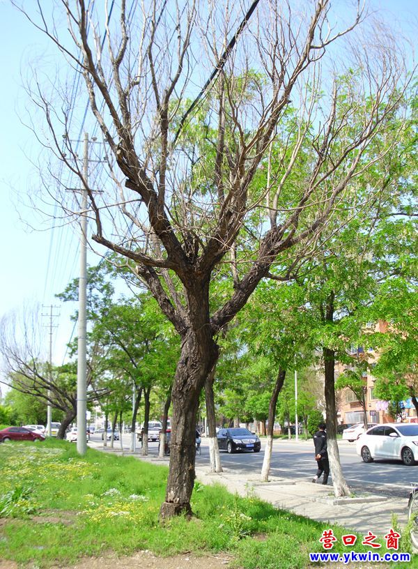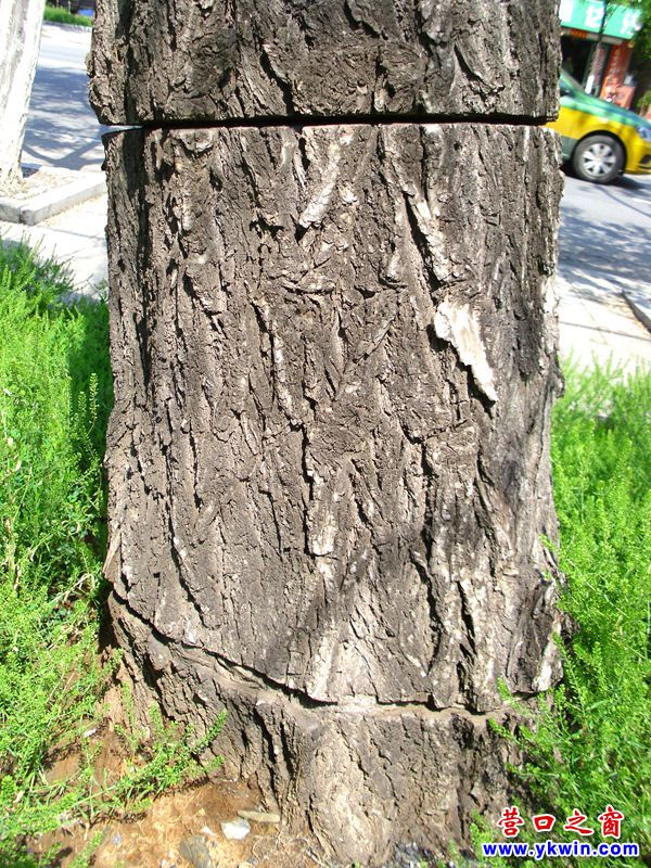 (營口之窗網(wǎng)訊 胡 然)5月25日,在營口市太和北街唯美品格小區(qū)段見到兩棵腰一樣粗的大樹今春沒有發(fā)牙。仔細察看,發(fā)現(xiàn)它們主干的皮各自都被環(huán)鋸了兩圈,兩樹因養(yǎng)分斷供饑渴而死。
