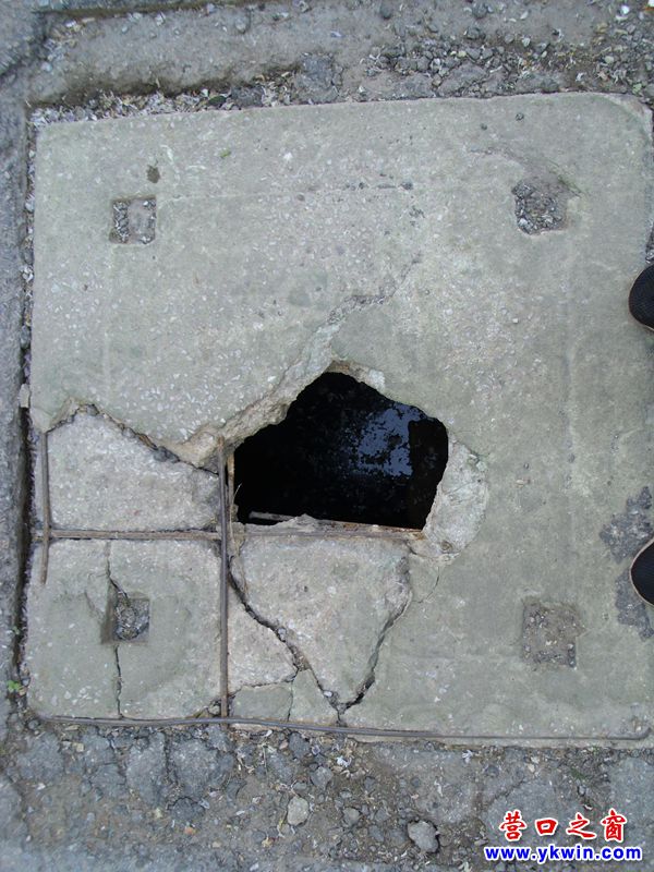 (營(yíng)口之窗網(wǎng)訊 胡 然)昨日,在營(yíng)口市太和北街通往躍進(jìn)辦事處振華社區(qū)和渤海明珠小區(qū)的無名小馬路上的一個(gè)井蓋上出現(xiàn)了酷似電動(dòng)車鞍座般大小的破洞,從現(xiàn)場(chǎng)的跡象看,該井第二個(gè)同樣大的破洞即將誕生。見到拍照,一位老人說,趕緊報(bào)告……