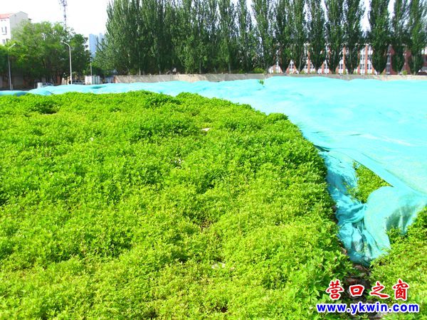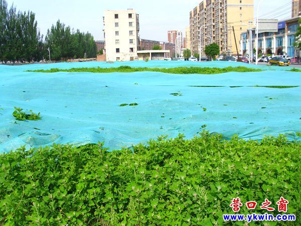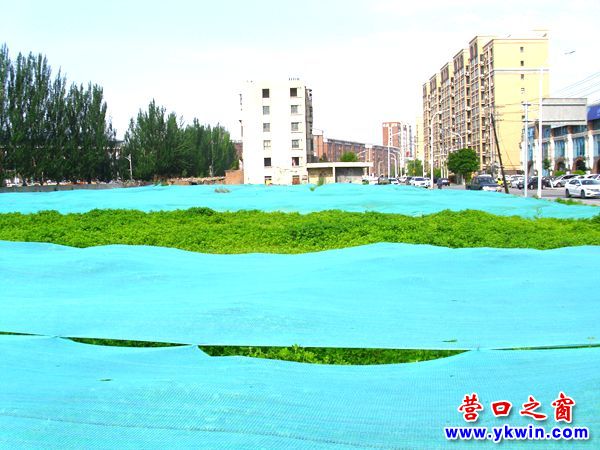 (營口之窗網(wǎng)訊 胡 然)時值5月28日,營口早已鮮花遍地,芳草萋萋。河畔小區(qū)西門對面那片空地上茂密的芳草也已長到一尺多高了。然而令人不可思議的是,在它們的頭上依然覆蓋著冬天的防塵網(wǎng)。