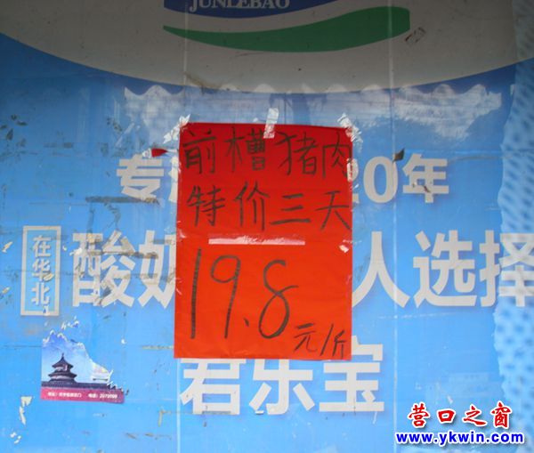 (營(yíng)口之窗網(wǎng)訊 胡 然)10月11日,營(yíng)口市公園路邊的一爿超市的門臉上張貼了一張大紅廣告:前槽豬肉特價(jià)三天,19.8元/斤。走進(jìn)超市見到前槽豬肉非常新鮮,與此前二十多元一斤的前槽豬肉一樣好。象這樣低于20元的豬肉售價(jià)在市內(nèi)外足有數(shù)月不見了。毫無疑問這是個(gè)期盼已久的喜訊。