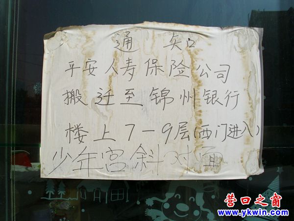 (營口之窗網(wǎng)訊 胡 然)“中國平安”四個大字在營口市盼盼路北端的一幢樓上已經(jīng)懸掛了多年,可是到了現(xiàn)在還不撤下來就毫無意義了,因為中國平安人壽保險公司營口分公司早已搬到錦州銀行7樓8樓9樓去了。