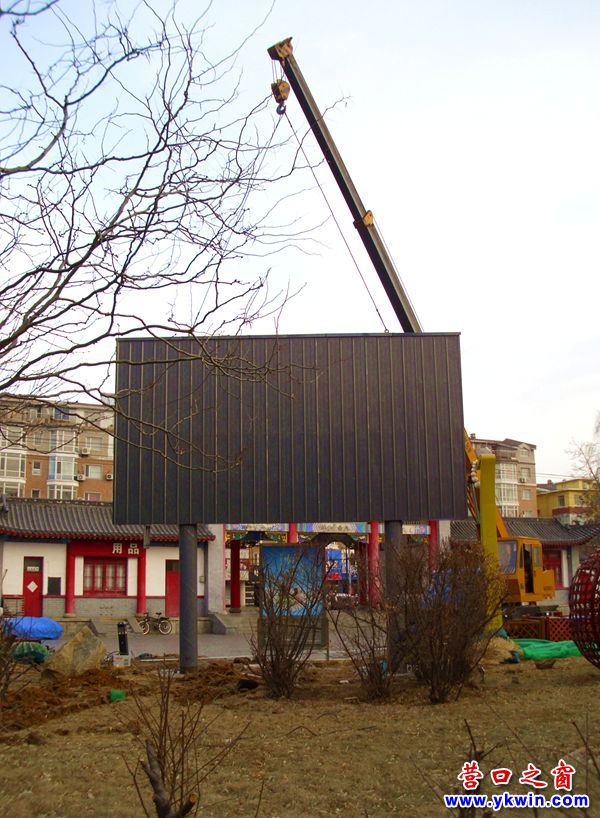 12月29日早晨,見到3名工人師傅正在冒著嚴(yán)寒在營口市楞嚴(yán)寺公園北門內(nèi)廣場安裝LED顯示屏。這是該園繼上個(gè)月建了有聲圖書館后增設(shè)的又一件基礎(chǔ)設(shè)施。