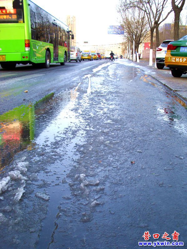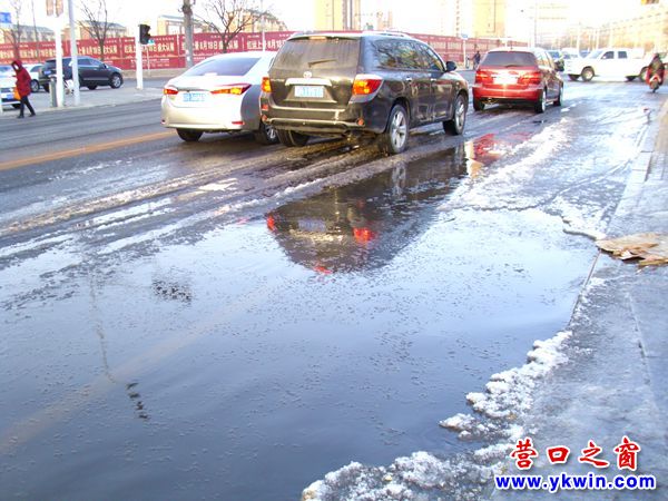 (營(yíng)口之窗網(wǎng)訊 胡 然)1月13日早晨,由于人行道上兩處“涌泉”,營(yíng)口市新興大街(華夏大酒店段)北側(cè)突現(xiàn)百米冰水河,其人行道也被淹沒(méi),由此西行的機(jī)動(dòng)車(chē)一輛輛碾壓冰水經(jīng)過(guò),而非機(jī)動(dòng)車(chē)和行人則無(wú)路可走。