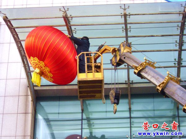 (營口之窗網(wǎng)訊 胡 然)2月6日,營口移動公司動用一輛大吊車在其門口上方20多米高的雨搭下面懸掛4只特大的紅燈籠。觀察發(fā)現(xiàn),在這么高的雨搭下面懸掛紅燈籠,不用大吊車還真就沒有其他辦法。