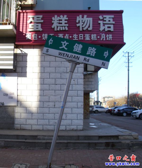 (營口之窗網(wǎng)訊 胡 然)2月22日,經(jīng)過營口市文健路(建設(shè)街通往紅旗小學)見到其標牌傾斜了45°,它似乎在告訴行人此路是個上坡路。其實,文健路十分平坦。