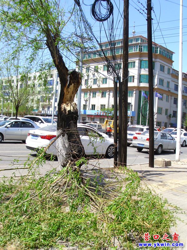 (營口之窗網訊 胡然)5月11日,營口市公園路與東風路十字路口東南角一棵柳樹落地一周的樹頭已經清除干凈,可是,殘余的另一開裂的枯枝仍有隱患,隨時都會砸下來。