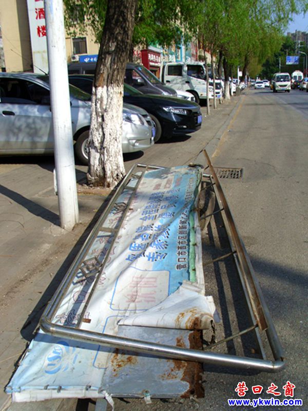 (營口之窗網訊 胡然)5月14日,擺放在營口市建豐大市場對面的車架廣告牌已經破損并倒在了路邊。它現在不僅毫無用處,而且妨礙交通。
