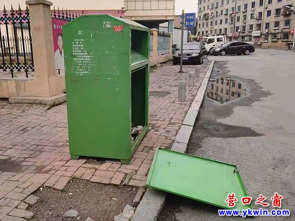 (營口之窗網(wǎng)訊 李凱)昨天,營口市站前區(qū)東升路大潤發(fā)超市北收貨區(qū)東側(cè),擺放在路邊的舊衣物回收箱箱門掉了,大敞四開,令捐贈者尷尬。