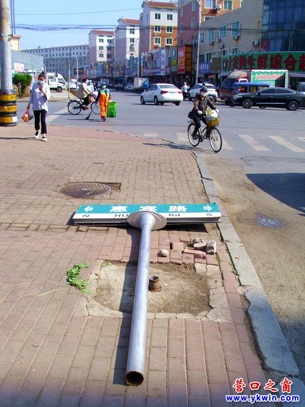 (營口之窗網(wǎng)訊 胡然)5月27日,位于營口市惠賓路與新興大街十字路口的路標竟然躺地上迎賓,行人要想找到它還得費點勁。它之所以躺著,是因為根部出了問題。責任部門快來施救吧。