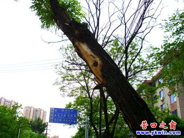 (營口之窗網(wǎng)訊 胡然)6月15日,沿著營口市太和北街西行至泰和公園東五六十米處時,發(fā)現(xiàn)街邊一棵老樹向街中傾斜近45度之多,其樹干因此被車蹭掉了一塊皮。它之所以沒徹底倒下,是因為它搭在了通訊線纜上。