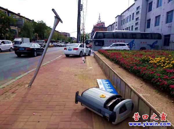 被撞掉的路牌和被撞倒的垃圾箱