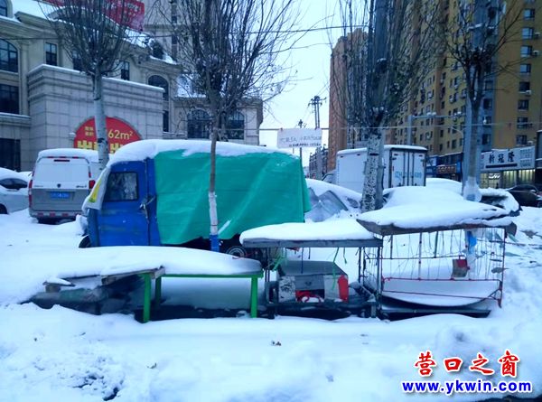 (營口之窗網(wǎng)訊 胡 然)“夜來城外一尺雪”。11月8日早晨醒來,展現(xiàn)在營口市市民眼前的是當(dāng)年賣炭翁遇到的雪情。這場暴雪,讓營口市尚未結(jié)束的大菜市戛然而止。在太白路大菜市,菜農(nóng)還沒賣完的白菜、蘿卜和大蔥全都被苫布包裹了起來,沒有一人賣,也沒有一人買。