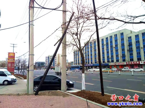 (營(yíng)口之窗網(wǎng)訊 胡 然)日前,逛營(yíng)口市金牛山大街。在客運(yùn)站斜對(duì)面至建豐派出所段發(fā)現(xiàn)兩根通訊線桿傾斜:一根向南倒,另一根朝北歪,再看向南倒的線桿周圍那是一片垃圾,與漂亮的金牛山大街形成強(qiáng)烈的反差。