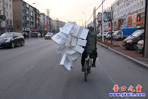 (營口之窗網(wǎng)訊 李凱)昨天傍晚時分,在營口市區(qū)西部,一女子騎自行車左手拎一串廢棄的泡沫箱,搖搖擺擺行進在快車道上,路人都替她捏把汗。