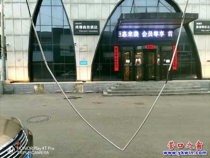 (營口之窗“百姓報告”)下圖是我上班的《鴻尊商務(wù)酒店》門口,一條不知道是什么電線脫落下來了,很久沒有人管。地點在海關(guān)南鄰(原針織二廠)南北道上,此處每天都有大量的車輛和行人經(jīng)過不知道會不會造成傷害。誰來管這事?希望能有人管理!