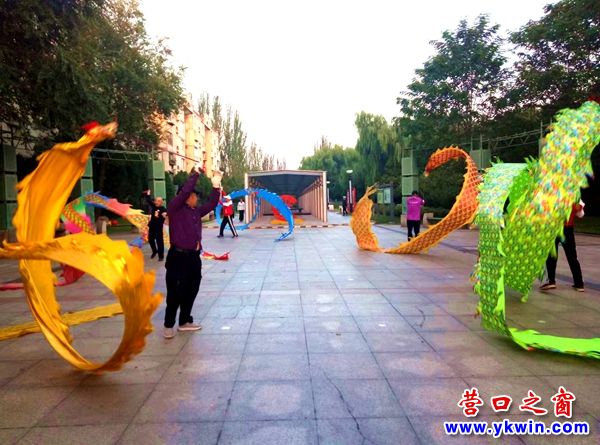 (營(yíng)口之窗網(wǎng)訊 胡 然)古老的東方有一條龍,它的名字就叫中國(guó),古老的中國(guó)有一群人,他們?nèi)际驱埖膫魅?hellip;…9月28日,伴隨著這首耳熟能詳?shù)母枨?,一支舞龍?duì)在營(yíng)口市人民公園東門廣場(chǎng)舞龍的過(guò)程中突然用五條龍編出了一個(gè)大大的五星,以此迎接國(guó)慶節(jié)的到來(lái)。