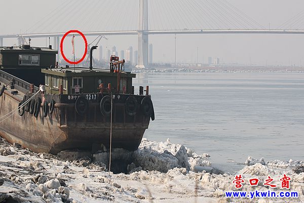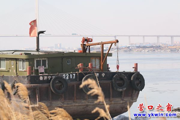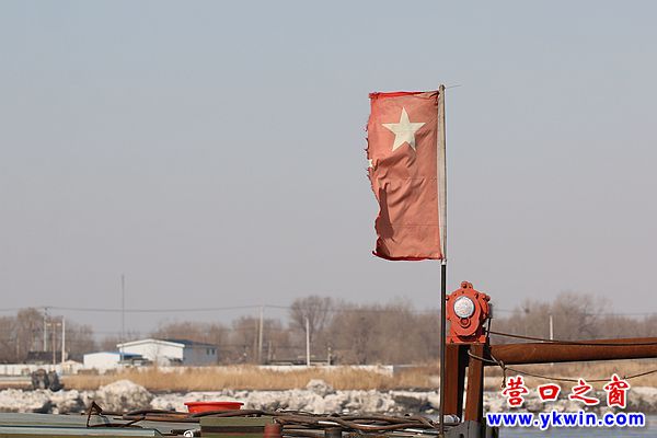(營口之窗網(wǎng)訊 李凱)昨天,在營口市市區(qū)渡口看到,??吭诎哆叺囊粭l船上,一面帶著淺淺的紅色、僅剩一顆星的殘缺國旗,在船頭旗桿上隨風飄搖。