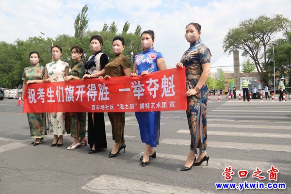 營(yíng)口市二高中考場(chǎng)外,公安、交警等部門(mén)的工作人員全力護(hù)航考場(chǎng)周邊秩序與安全。市西市區(qū)西市場(chǎng)社區(qū)“海之韻”模特藝術(shù)團(tuán)以最美旗袍人的形象展現(xiàn)行動(dòng),為高考學(xué)子減壓助威,她們對(duì)每一位入場(chǎng)的考生給予鼓勵(lì),成了高考考點(diǎn)一道靚麗的風(fēng)景線。西市場(chǎng)社區(qū)“海之韻”模特藝術(shù)團(tuán)團(tuán)長(zhǎng)張海表示,希望以一身靚麗的旗袍,為考生們送上美好祝愿,祝全市參加高考的莘莘學(xué)子們金榜題名,旗開(kāi)得勝,成為祖國(guó)棟梁之材!