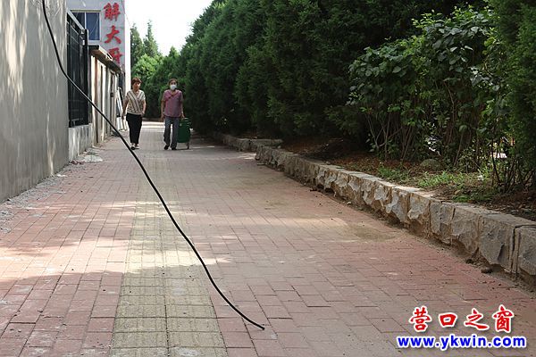營口之窗網(wǎng)訊(李凱 攝影報道)昨天在營口市站前區(qū)新華路靶場小區(qū)樓外看到,一條黑膠線纜垂落到地面上,對市民出行造成極大不便,且存在一定的安全隱患,希望有關(guān)部門能夠管一管。
