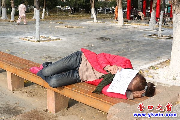 營(yíng)口之窗網(wǎng)訊(李凱 攝影報(bào)道)11月9日,在營(yíng)口市楞嚴(yán)寺公園看到,一女子躺在長(zhǎng)椅上,臉上遮擋一塊紙,上寫道:曬太陽(yáng)呢,沒(méi)死,謝謝。