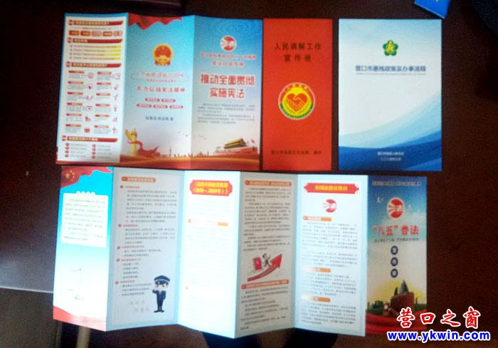 活動現(xiàn)場發(fā)放的法治宣傳材料有《推動全面貫徹實施憲法》、《“八五”普法》、《人民調(diào)解工作宣傳冊》和《營口市惠殘政策及辦事流程》等。