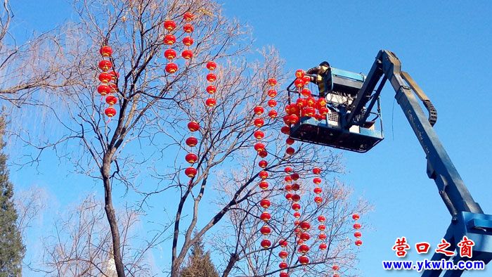 在楞嚴寺公園南門,工作人員正在高空往樹上掛星羅棋布的紅燈籠,這就好比果滿枝頭等著春姑娘品嘗。