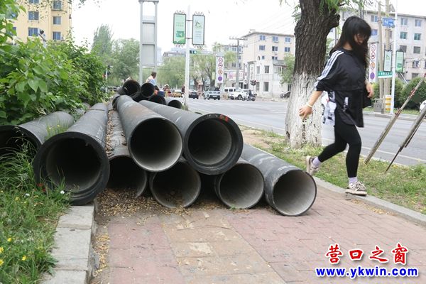 營(yíng)口之窗網(wǎng)訊(李凱 攝影報(bào)道)6月2日,在營(yíng)口市站前區(qū)體育館路與智泉街交匯處南側(cè)的人行道上,堆滿(mǎn)了管件,好似患了“腸梗阻”,又像是遭遇“攔路虎”,給行人帶來(lái)一定的安全隱患。