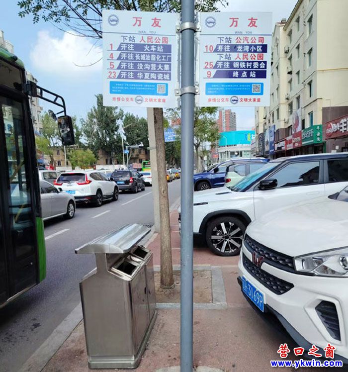 這家超市門前的街邊就是公交車萬友站。這個站雖有1路、4路、5路、9路、10路、23路和25路公交車停靠卻沒有候車座椅和遮陽棚,只有一個光桿站牌。