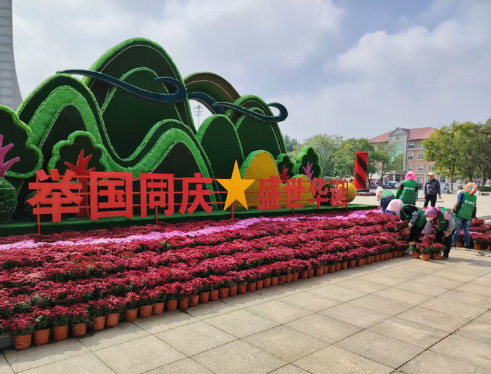 在遼河廣場,一群園丁正在擺放鮮花裝飾一塊寫著“舉國同慶 盛世華誕”的青山巨牌迎國慶。