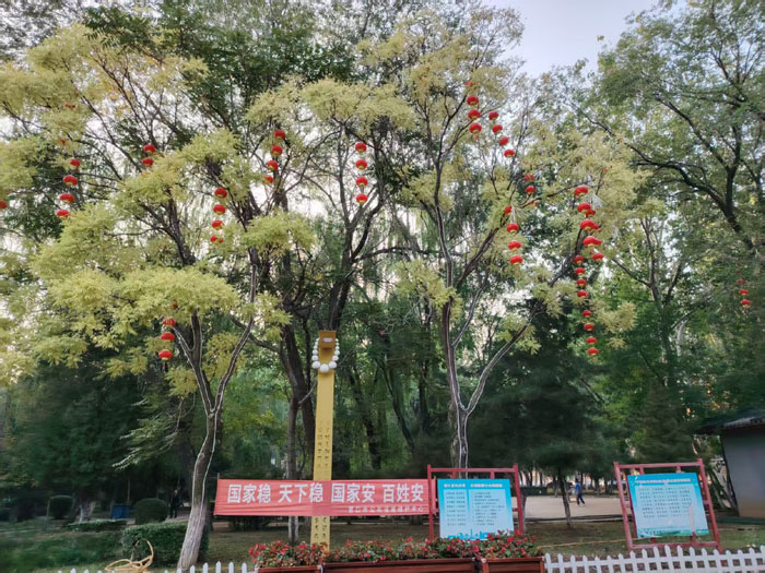 在楞嚴(yán)寺公園,眾多鮮紅的燈籠紛紛爬到上樹迎國慶。
