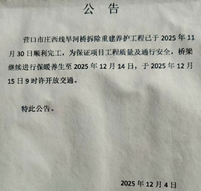橋頭的《公告》稱,該橋預計2025年12月14日保暖養(yǎng)生結束,2025年12月15日9時恢復通車。重建的新旱河橋比舊旱河橋略有加寬,變得與之相連的工農路同寬。