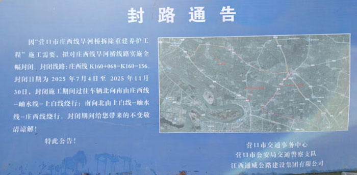 橋頭的《封路通告》顯示,該橋自2025年7月4日封閉至2025年11月30日止。因為新建的旱河橋需要保暖養(yǎng)生,所以才推遲半個月通車。