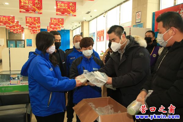 31日中午,營(yíng)口百年董氏生物科技有限公司員工及志愿者趕到了廣播電視大樓的一樓,那里是北方聯(lián)合廣播電視網(wǎng)絡(luò)股份有限公司營(yíng)口分公司的辦公地點(diǎn),工作人員正在堅(jiān)守崗位。營(yíng)口百年董氏生物科技有限公司董事長(zhǎng)董增軍及員工和志愿者將口罩分發(fā)給值班的工作人員,并向他們捐贈(zèng)了箱裝的消毒液。