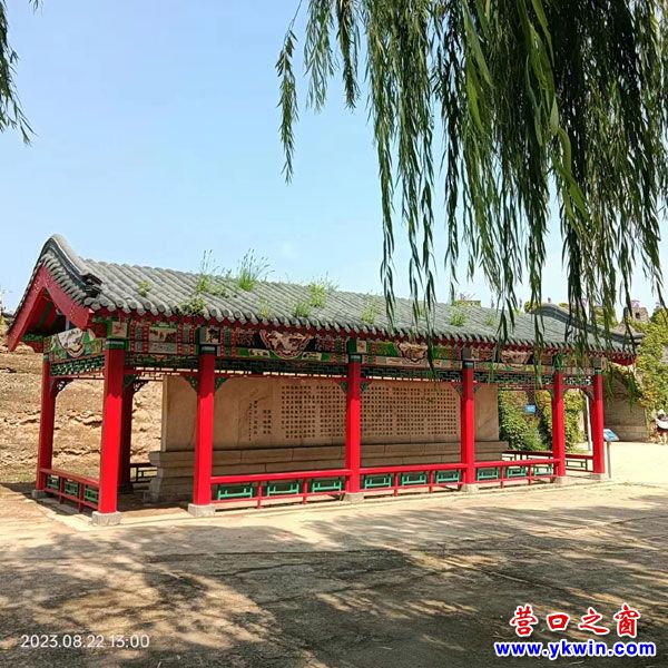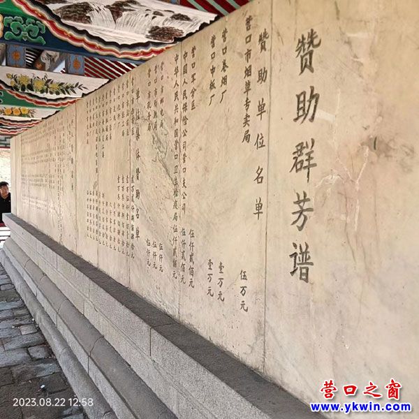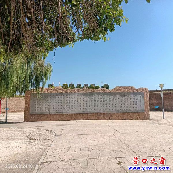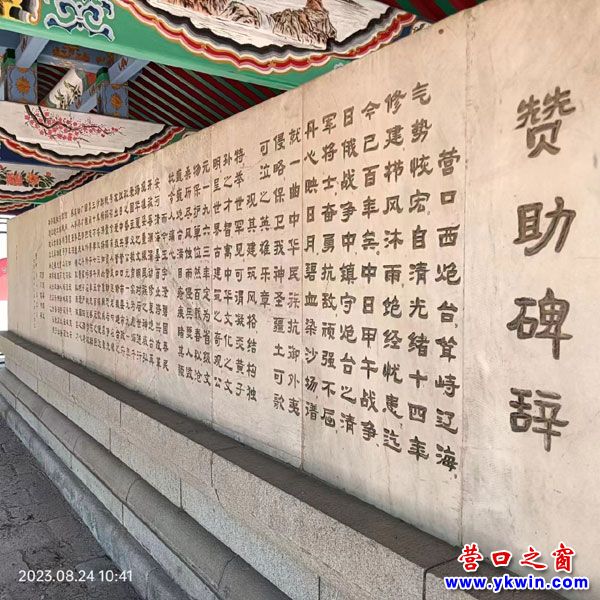 在西炮臺正門里的西側有冠名流芳亭的廊亭一座。此亭雕梁畫棟,頂蓋古典,整體俏麗端莊。亭內豎立玉石碑墻一座,高2.05米,長8.02米,厚0.6米。碑的正面是《贊助碑辭》,文字激揚頓挫,語言生動,表達了營口各界以及兄弟省市的人們踴躍捐款,為修復西炮臺再現(xiàn)雄姿,謳歌贊頌參加者功在當下,萬古流芳。碑的背面是《贊助群芳譜》,其中贊助單位有營口市黨、政、軍、工、農、商、學各界集體22個,捐贈金額為23.423萬元;個人捐款者132名,捐款金額為3.42萬元。二者相加共捐款人民幣27萬余元。(本人以石碑上的數據為準而計算,確切數據以政府統(tǒng)計為準)。這座石碑的立碑時間是1993年,距今整整30年。久久凝望捐助者的名字,不禁感動萬千。